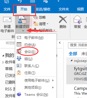 1、打开Outlook邮箱,找到“开始”菜单中的“新建项目”,再选“会议”。