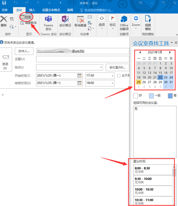 2、弹出对话框,输入“收件人…”相应邮箱地址。右上边的日历表中选择相关日期,右下角的“建议时间”进行选择“无冲突”时间段即可。