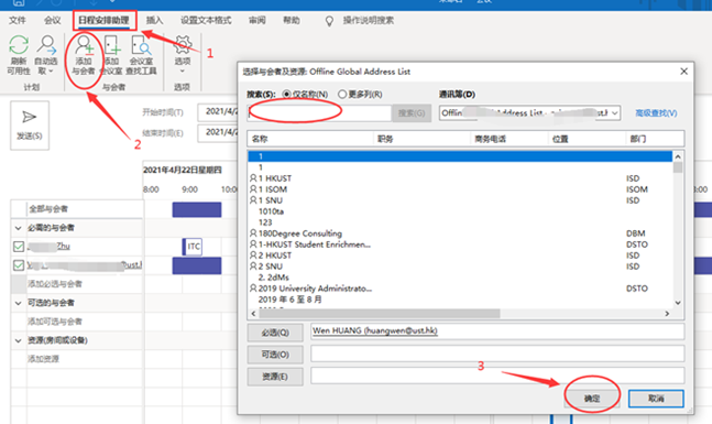 2、弹出对话框,找到“日程安排助理”菜单栏。点击“添加与会者”,在弹出对话框中输入相应邮箱地址,点“确定”。