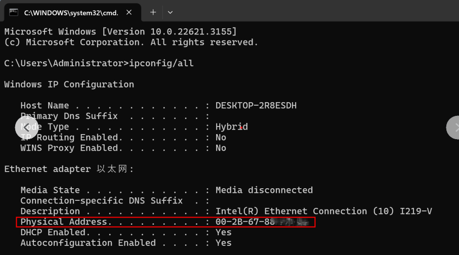 4. Multiple adapters may be listed. Each adapter should have a Physical Address. The Physical Address is the adapter’s MAC address.