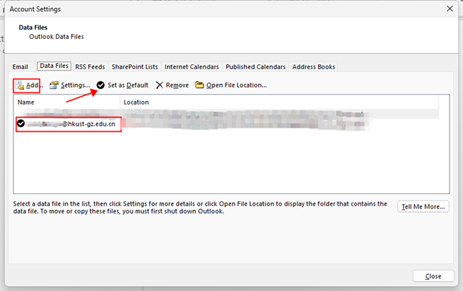 2. After following the above steps, you will be able to see a tab. Click on the “Data Files”, and then click ”Add…” to add a new location.