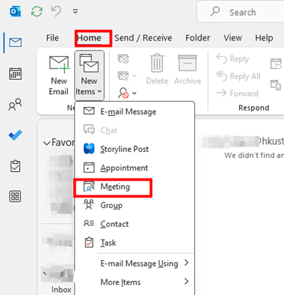 1. From Inbox, select Home>New Items>Meeting.