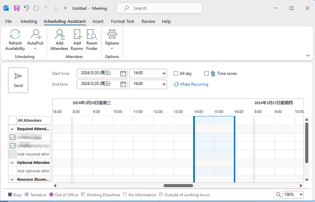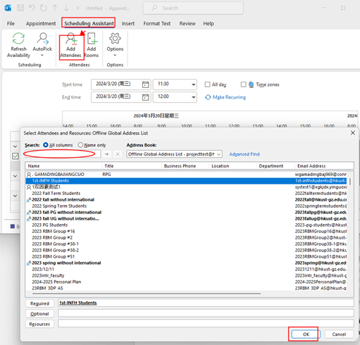 2. Find Scheduling Assistant>Add Attendees. Add email addresses of attendees in dialog box, and click “OK”.