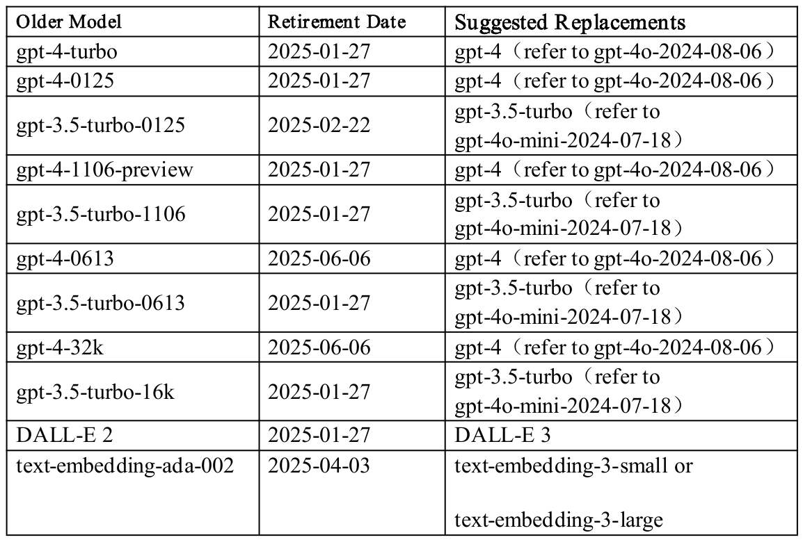 According to the latest model management regulations from the GPT provider, older models will be gradually retired starting in 2025. Research teams using the following older models are recommended to arrange for model replacement at early convenience.