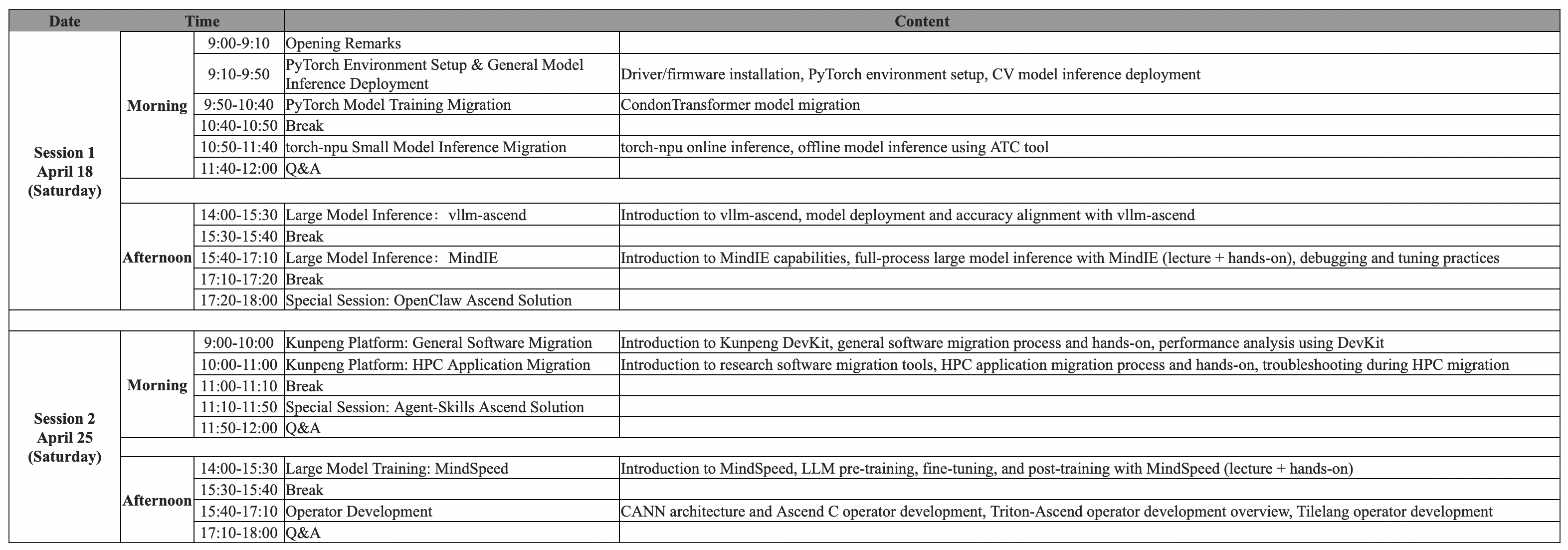 On-site sign-in will be arranged for each training session and small gifts will be provided for each session. Users who fully complete the training (attending both sessions with a total of four sign-ins) will receive a "Certificate of Completion" issued by the Kunpeng&Ascend Center of Cultivation.